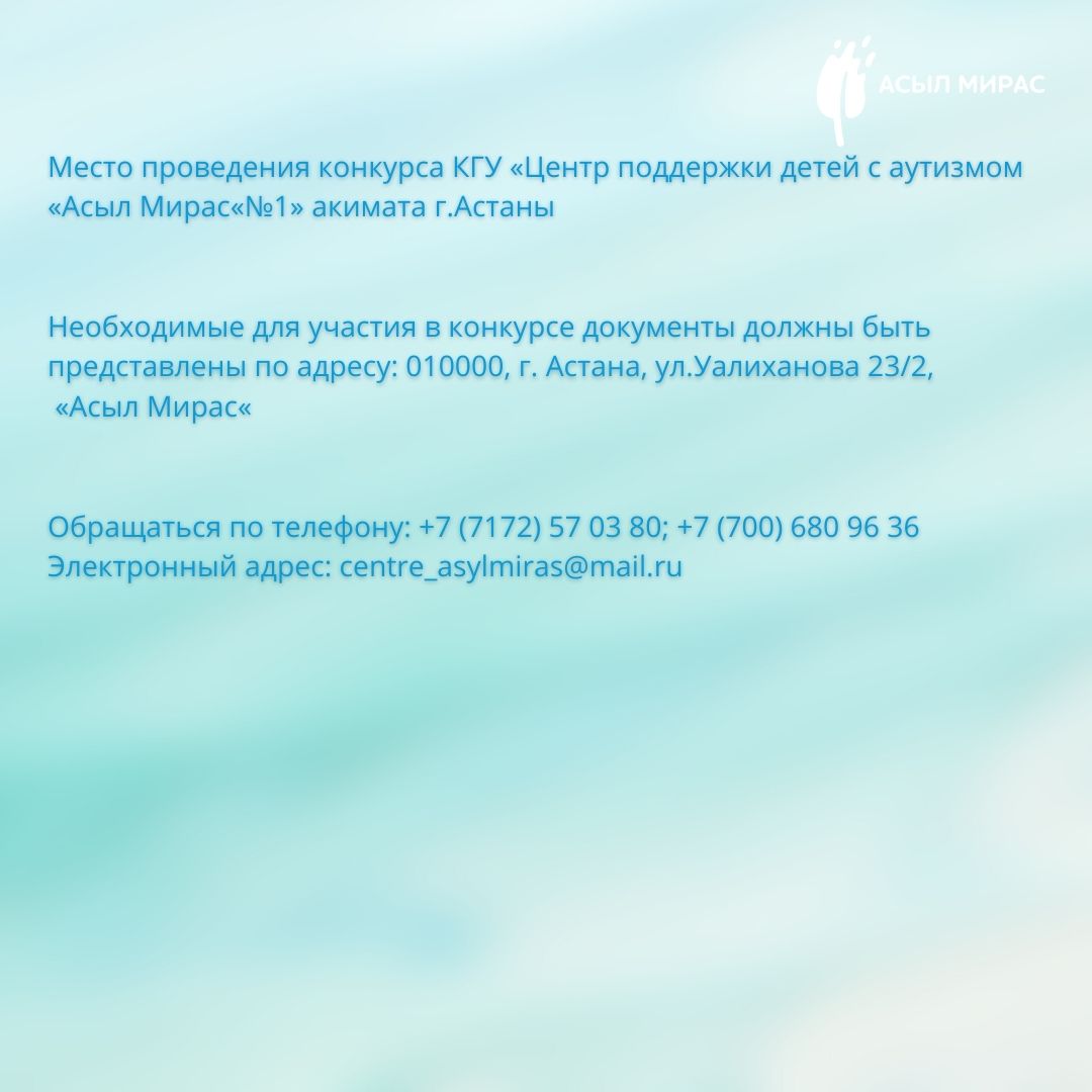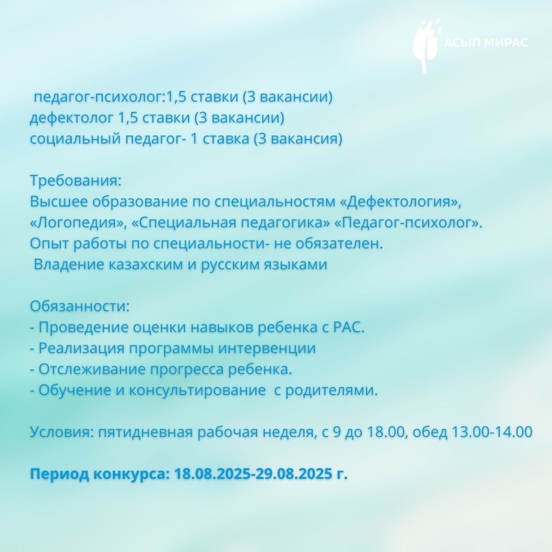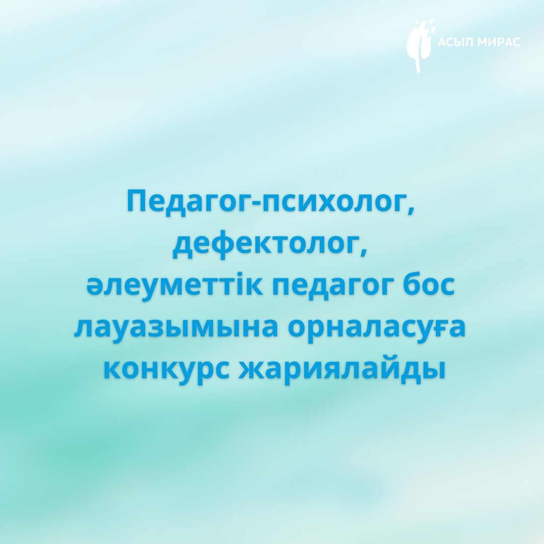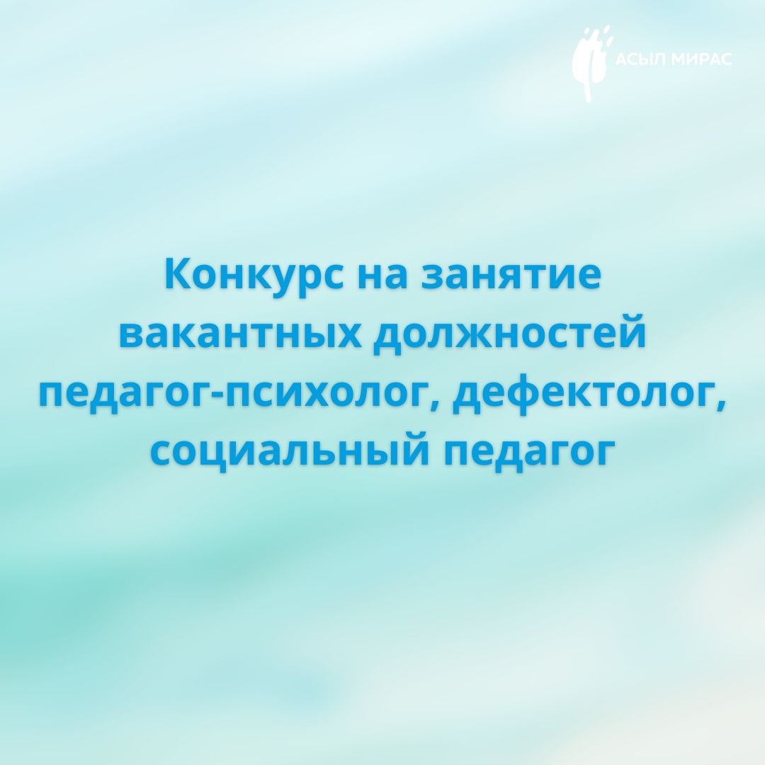 «No1 «Асыл Мирас» аутизмі бар балаларды қолдау орталығы» КММ уақытша бос лауазымға: педагогикалық психолог, дефектолог лауазымына орналасуға конкурстың қорытындысын хабарлайды.
