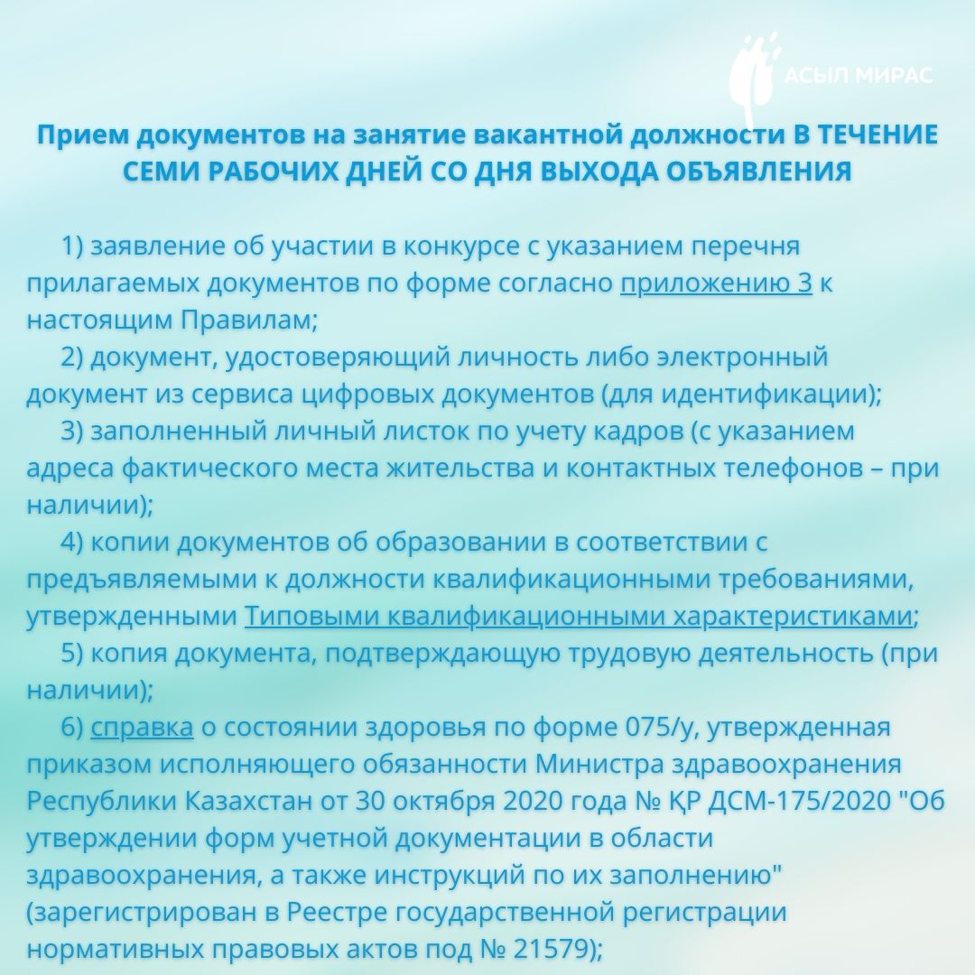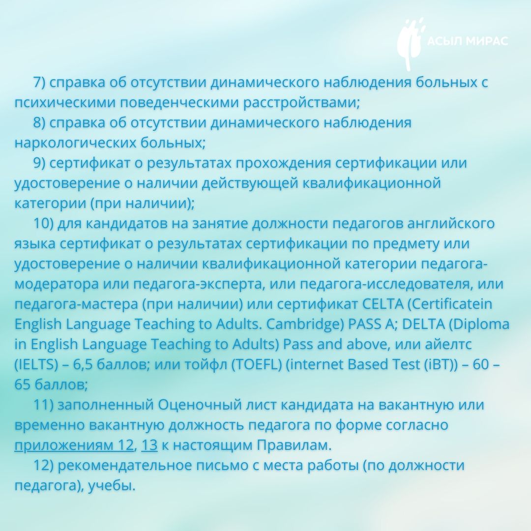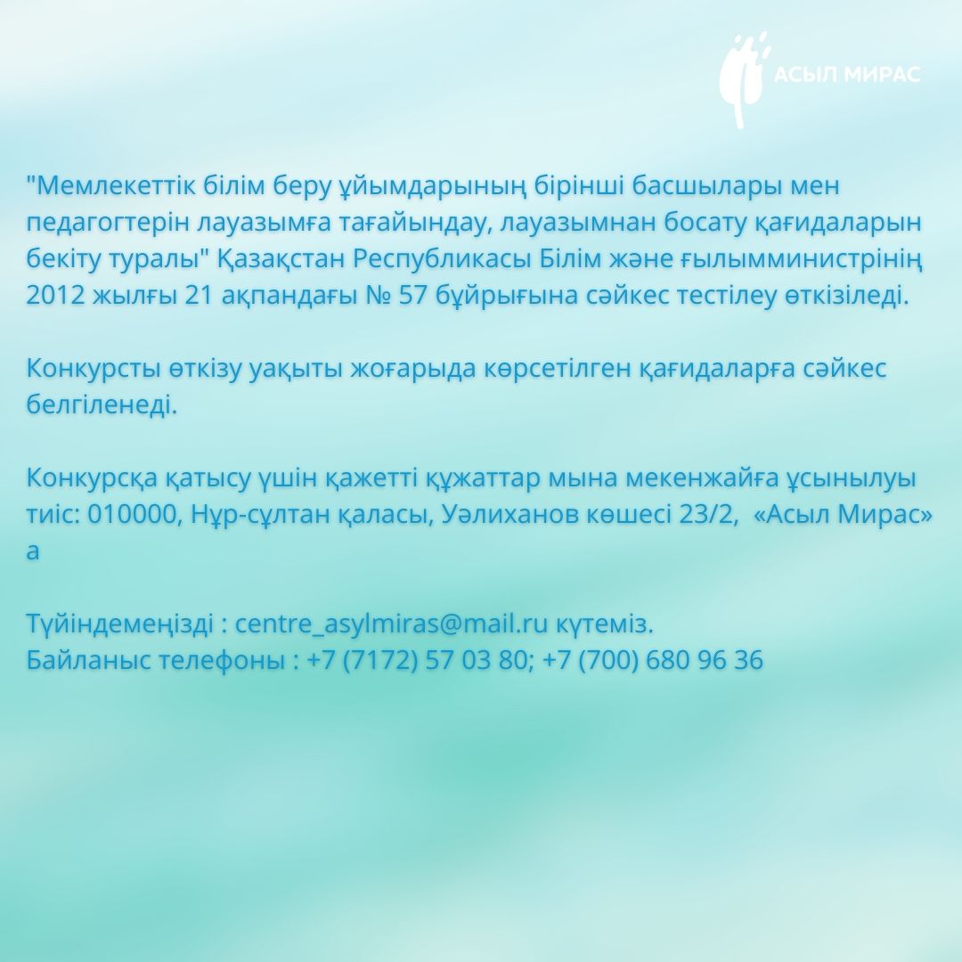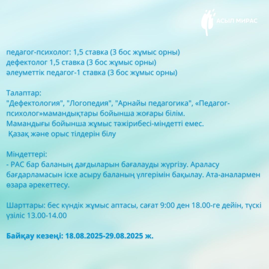 «No1 «Асыл Мирас» аутизмі бар балаларды қолдау орталығы» КММ уақытша бос лауазымға: педагогикалық психолог, дефектолог лауазымына орналасуға конкурстың қорытындысын хабарлайды.